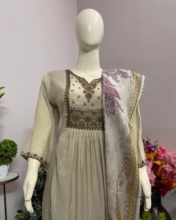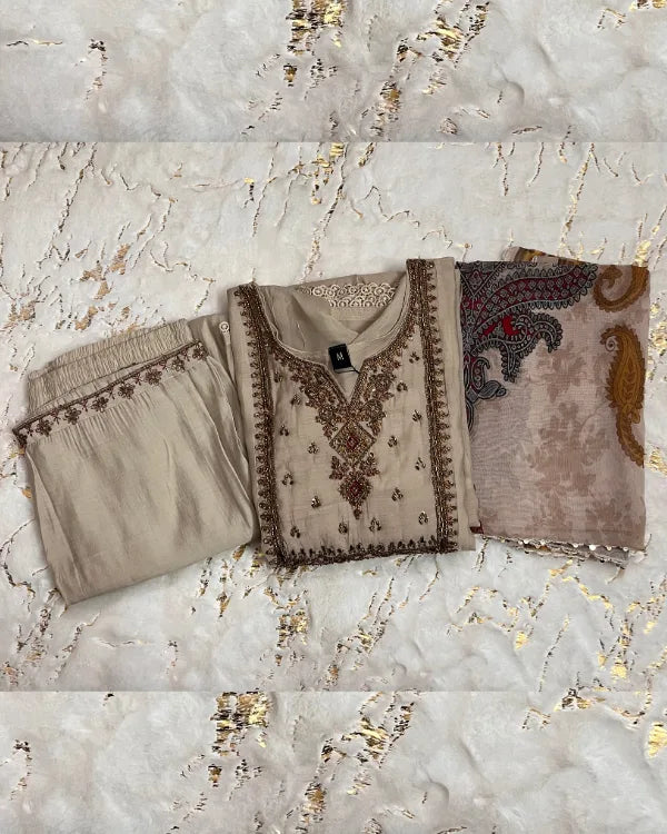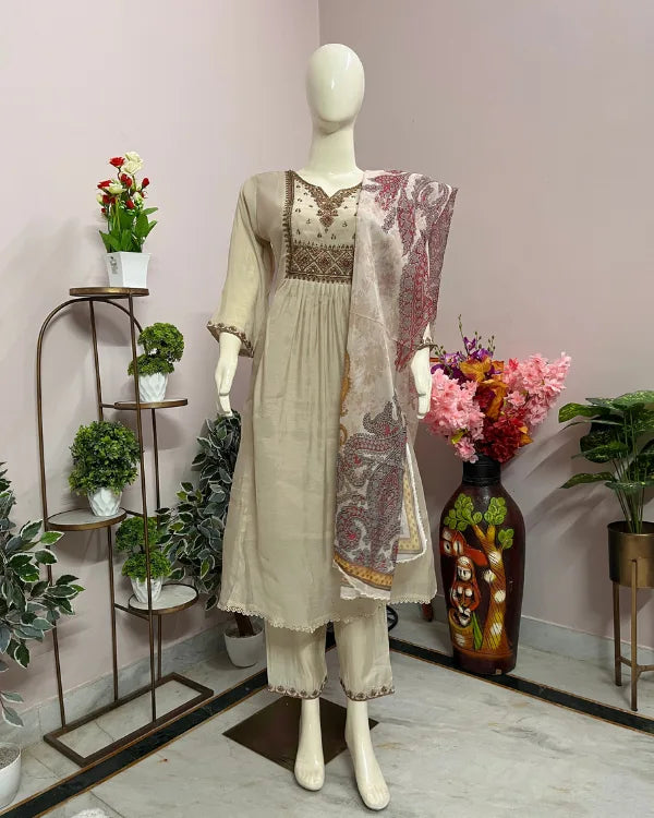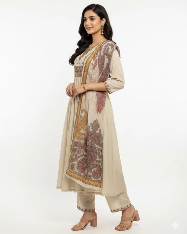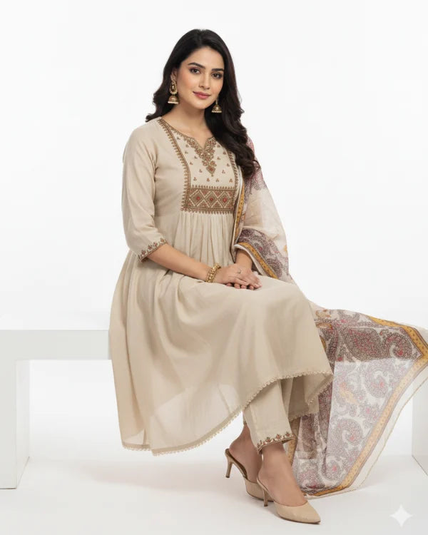 Embrace effortless elegance with this beige kurta set, thoughtfully designed with a touch of traditional charm. The straight-cut kurta features delicate embroidery on the yoke and sleeve edges, adding a refined ethnic appeal. Paired with matching pants adorned with subtle embroidered borders, the outfit ensures comfort and sophistication. The set is elevated with a soft, multi-hued printed dupatta showcasing intricate paisley motifs, perfectly balancing the understated beige base with vibrant accents. This versatile ensemble is ideal for casual gatherings, festive occasions, and semi-formal events.