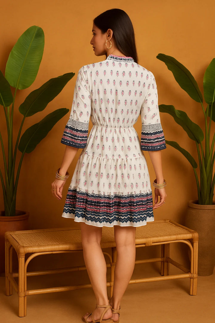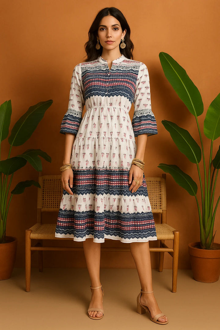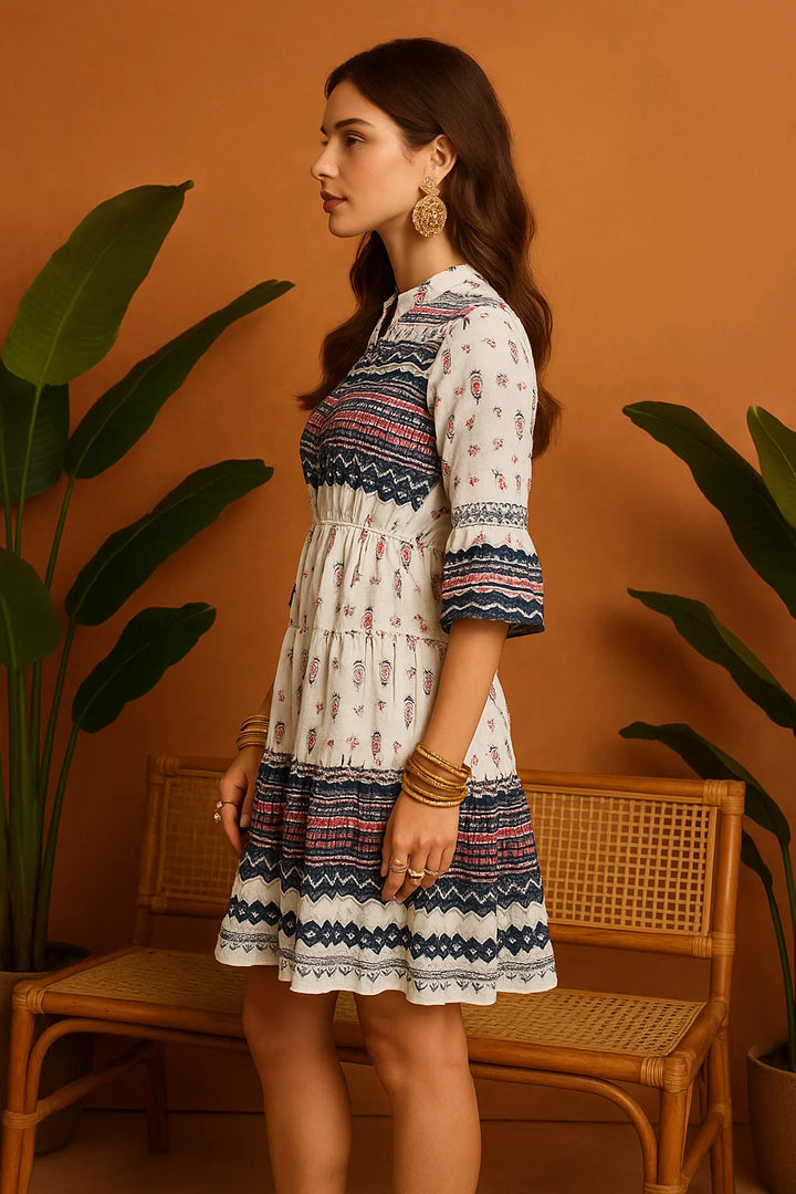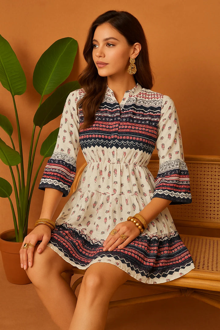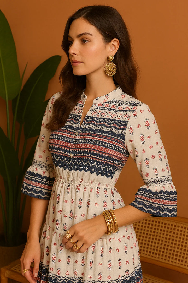 Channel your inner wanderer with this effortlessly chic boho midi dress. Featuring a smocked waist and sleeves, tribal-inspired prints, and a breezy silhouette, this dress is your go-to for casual outings, vacations, or brunch dates. The contrasting upper and hem panels add depth to the design, while the soft fabric ensures all-day comfort.