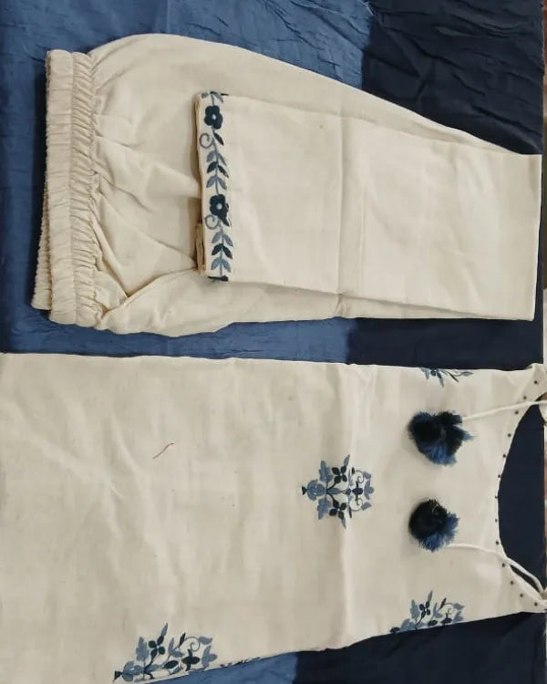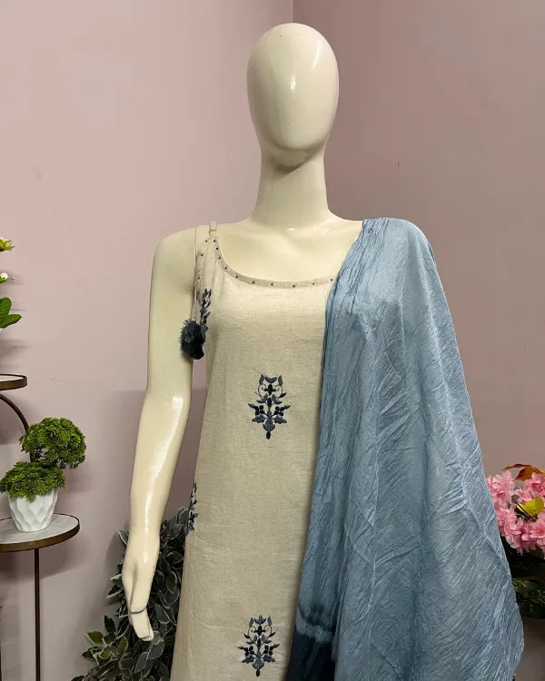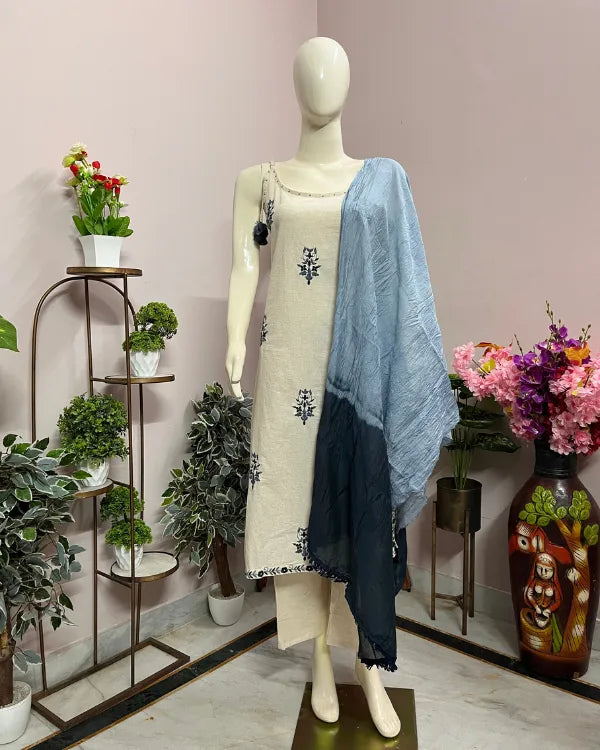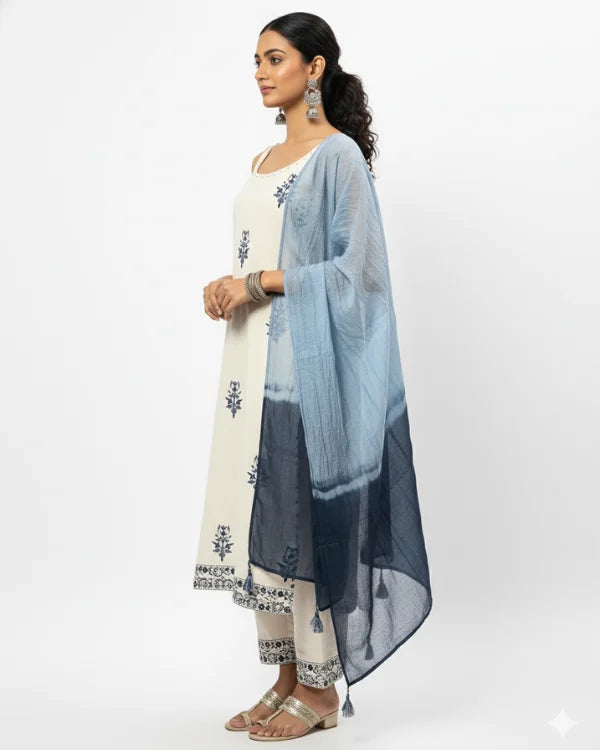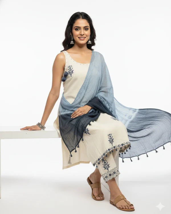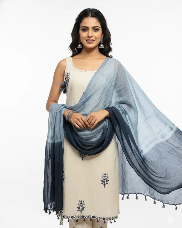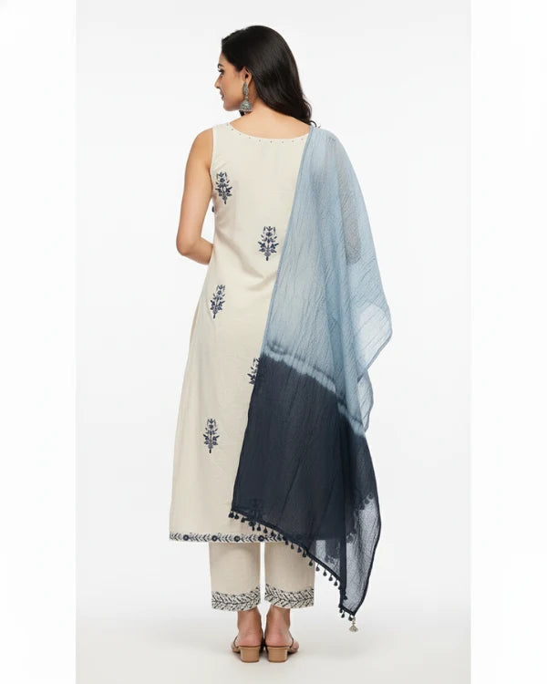 Step into subtle sophistication with this elegant cream and blue embroidered cotton suit set. The straight kurta features delicate navy blue thread embroidery in floral motifs, adding a touch of handcrafted charm to its minimalist design. The neckline is adorned with playful tassel detailing for an ethnic accent. It is paired with a matching cream bottom and a dual-tone ombré dupatta in shades of sky and navy blue, lending a graceful contrast to the soft cream base. This breezy and comfortable ensemble is perfect for casual gatherings, festive day events, or office wear.