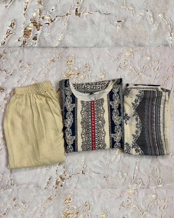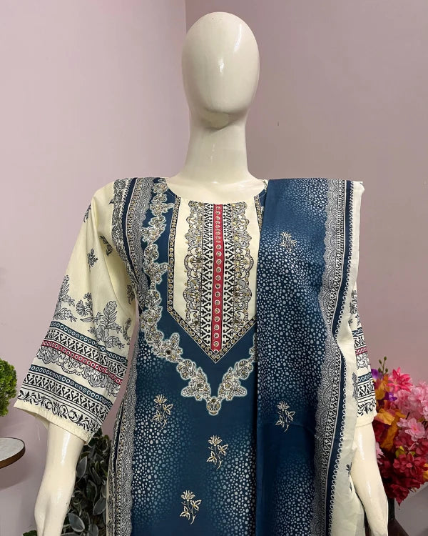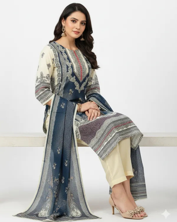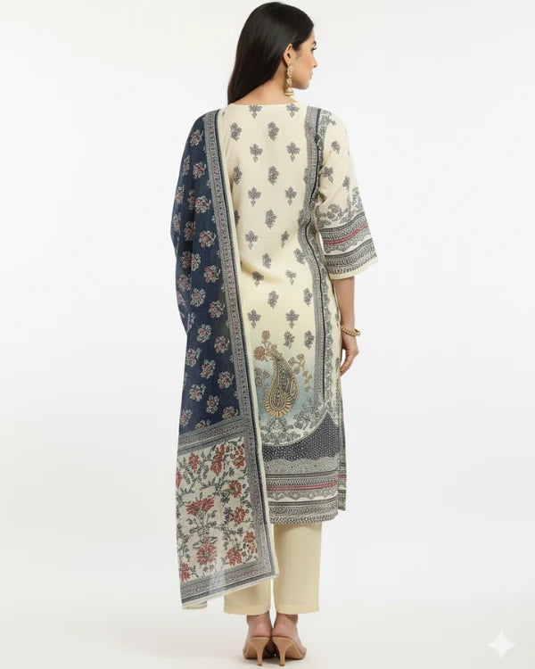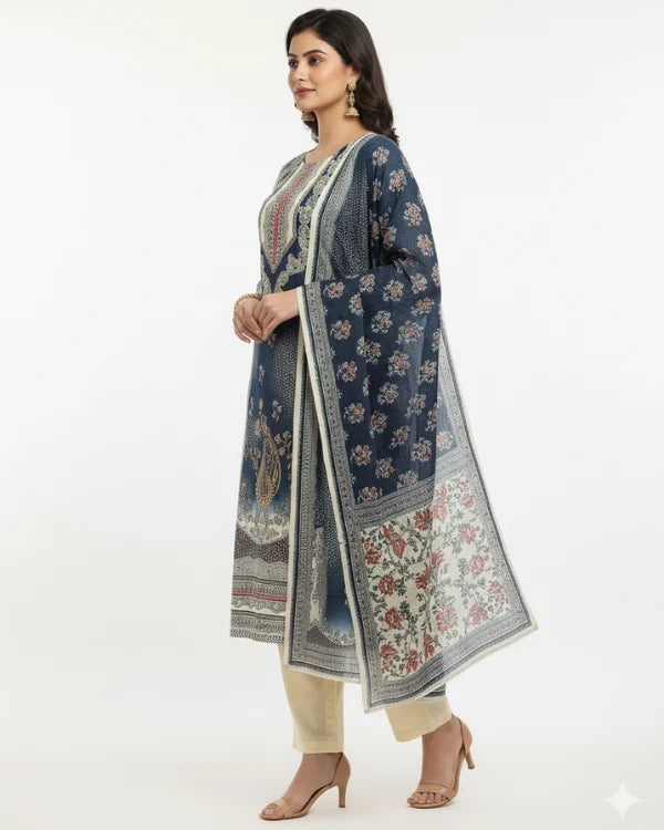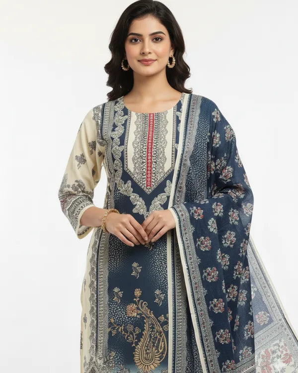 Bring effortless charm to your wardrobe with this elegant cream and navy printed cotton suit set. The straight-cut kurta showcases intricate traditional prints in shades of navy blue and maroon, highlighted with paisley and floral motifs for a graceful ethnic look. Paired with solid cream cotton bottoms, the outfit ensures everyday comfort without compromising on style. The set is completed with a beautifully printed navy dupatta featuring matching border designs, making it perfect for casual outings, festive gatherings, and semi-formal occasions.