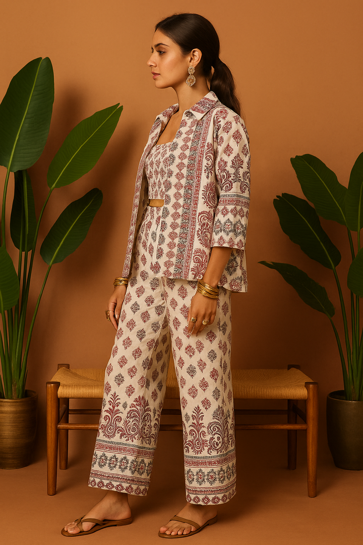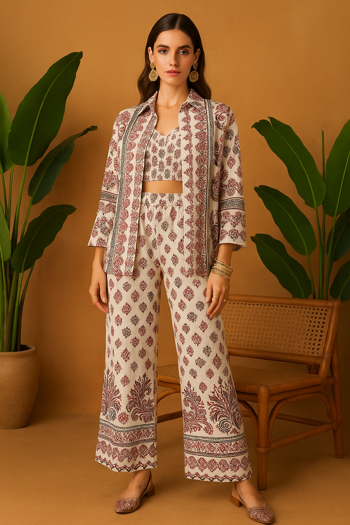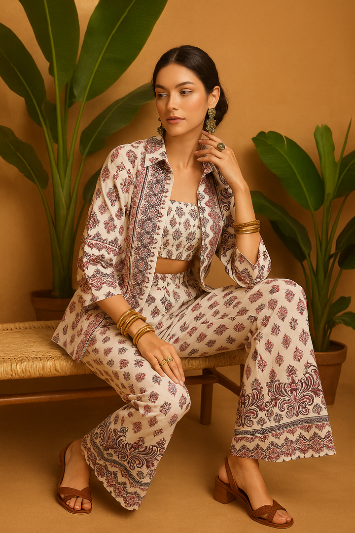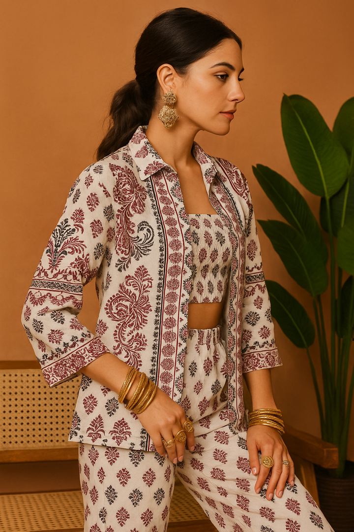 Ethnic Printed Co-Ord Set (Shirt, Croptop & Trousers)