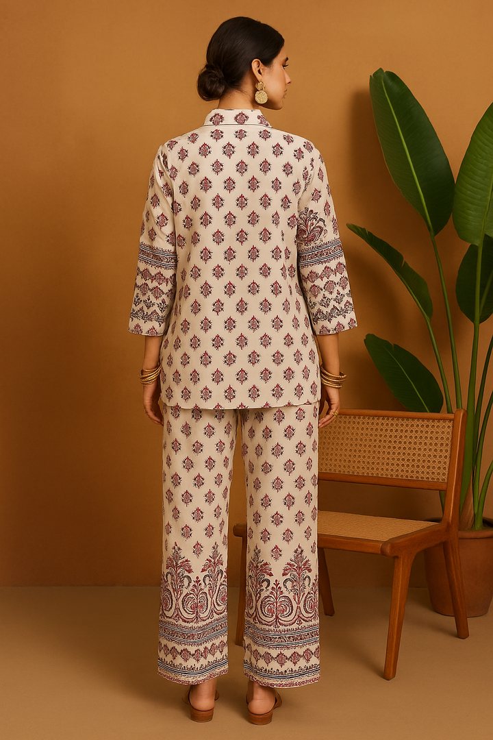 Bring tradition and trend together with this stunning co-ord set featuring an elegant all-over ethnic print. The set includes a button-down shirt with full sleeves and matching straight-fit trousers. With intricate maroon and black floral motifs on a white base, this outfit radiates a sophisticated Indo-fusion vibe.