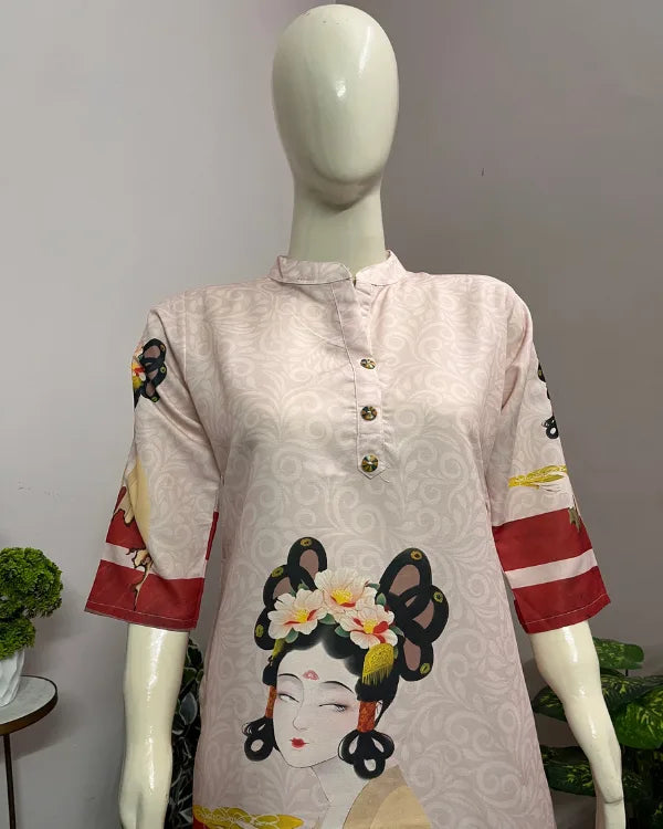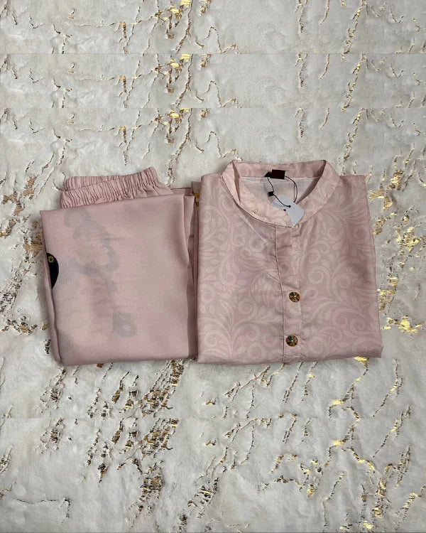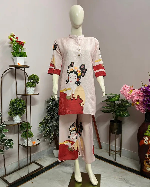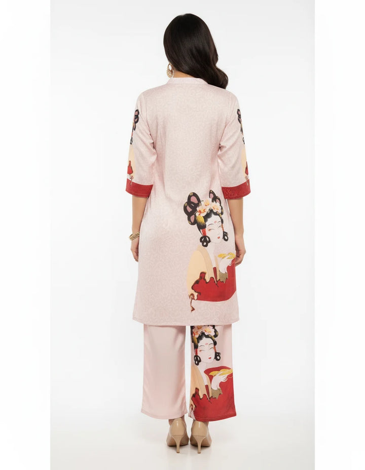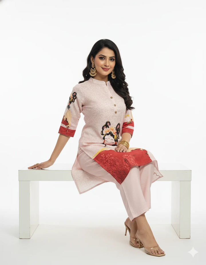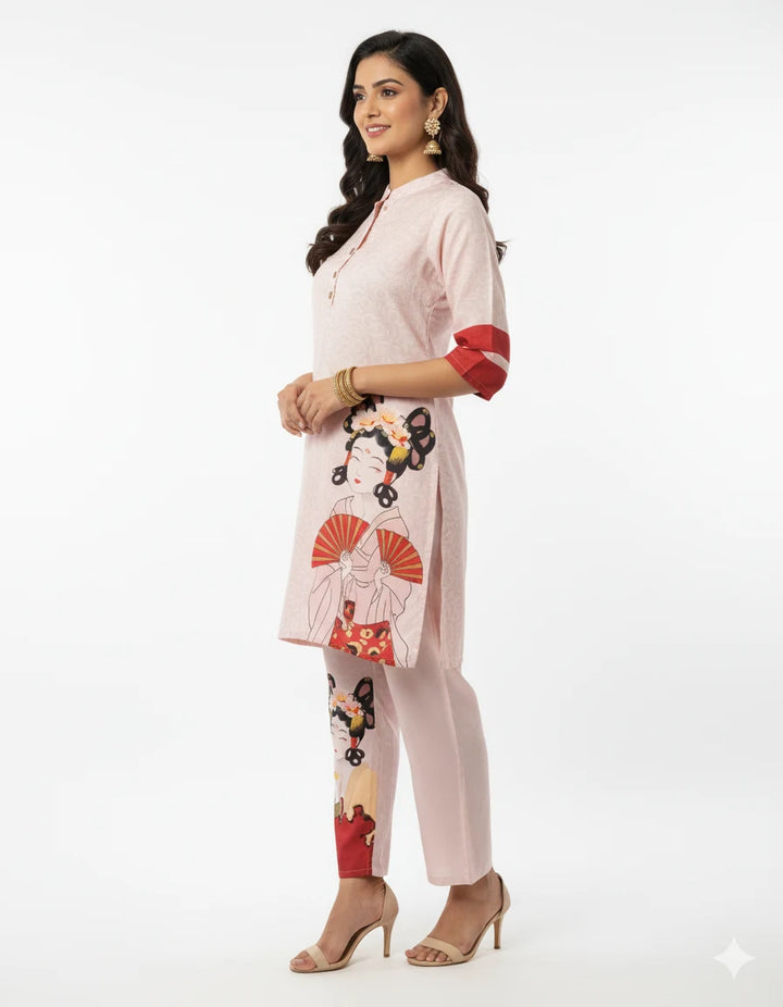 Add a touch of artistic charm to your wardrobe with this stylish light pink co-ord set featuring a vibrant printed design. The set includes a straight-cut kurta with a mandarin collar and three-quarter sleeves, adorned with unique artistic motifs in bold red, mustard, and black hues. The matching straight-fit pants mirror the kurta’s design, creating a perfectly coordinated and eye-catching ensemble. Crafted from soft, breathable fabric, this co-ord set ensures all-day comfort while keeping your style effortlessly chic. Ideal for casual outings, brunches, and festive gatherings, this outfit is a fusion of modern design and relaxed elegance.