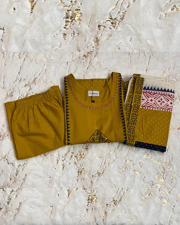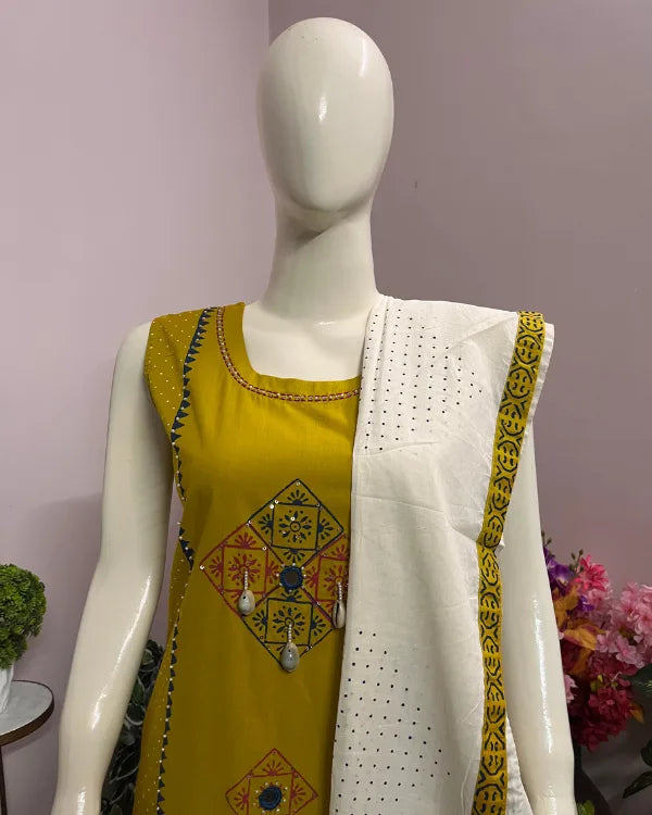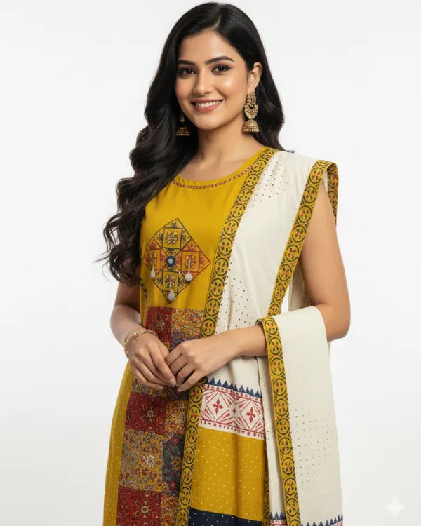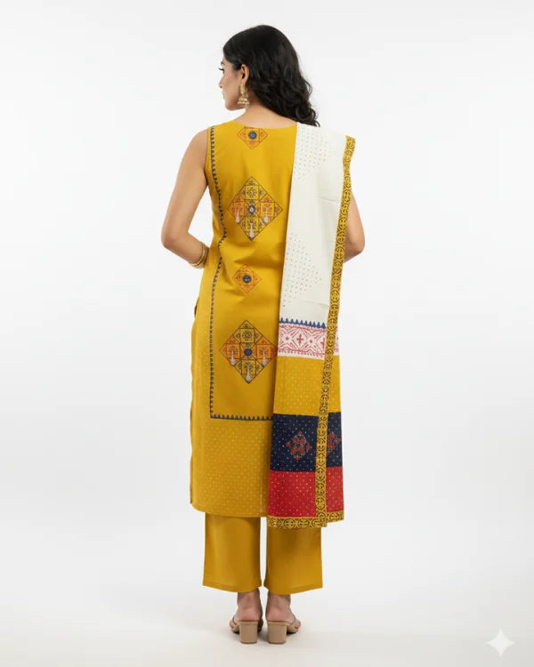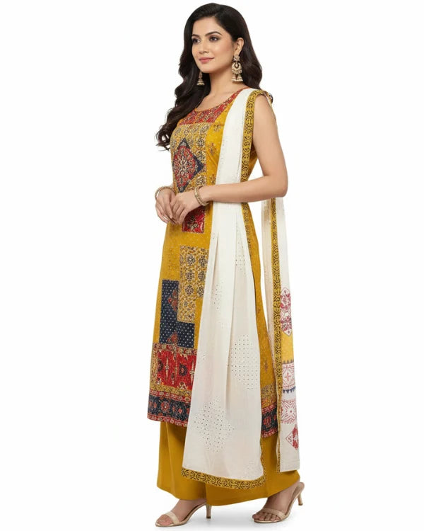 Bring vibrancy to your ethnic collection with this mustard yellow kurta set, beautifully designed with geometric and traditional-inspired printed motifs. The straight-cut kurta features a sleeveless design, offering both comfort and a chic look. It is paired with solid mustard pants for a coordinated finish. The highlight of the set is the contrasting white dupatta, embellished with multi-color block-style prints and border detailing, adding a stylish pop of color to the ensemble. Perfect for festive gatherings, casual outings, and daytime celebrations, this set strikes the perfect balance between tradition and contemporary charm.