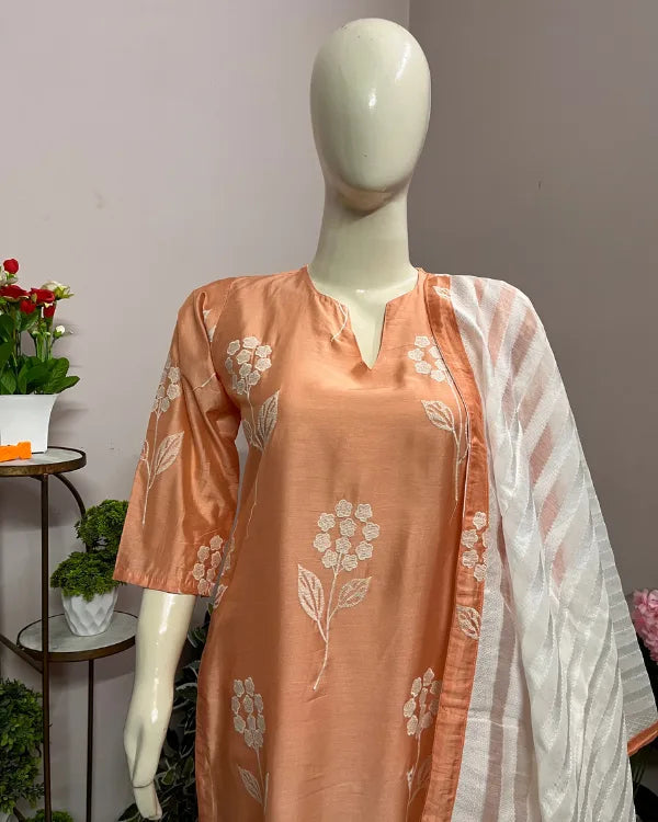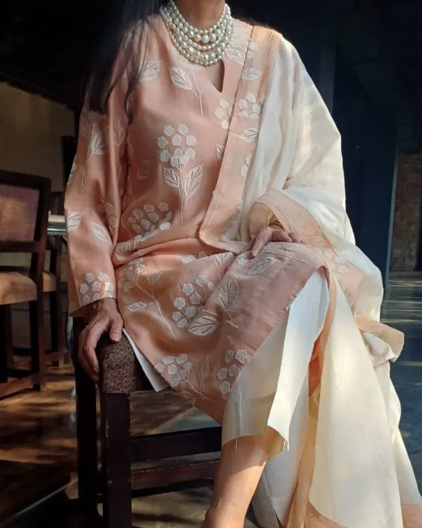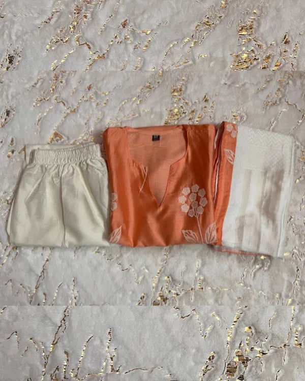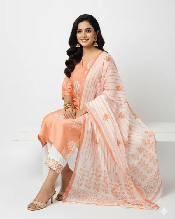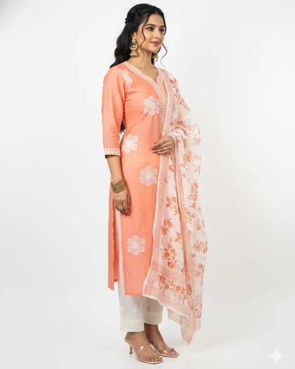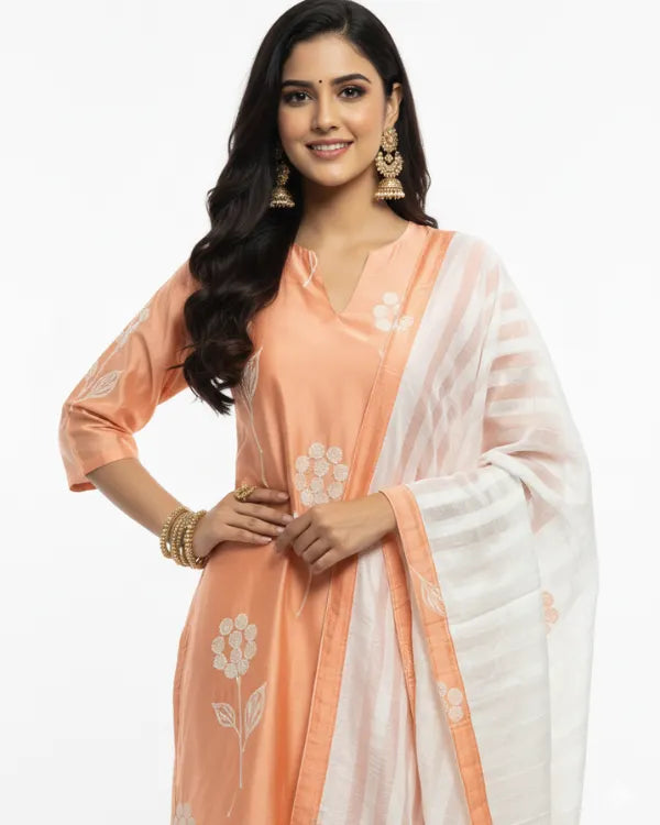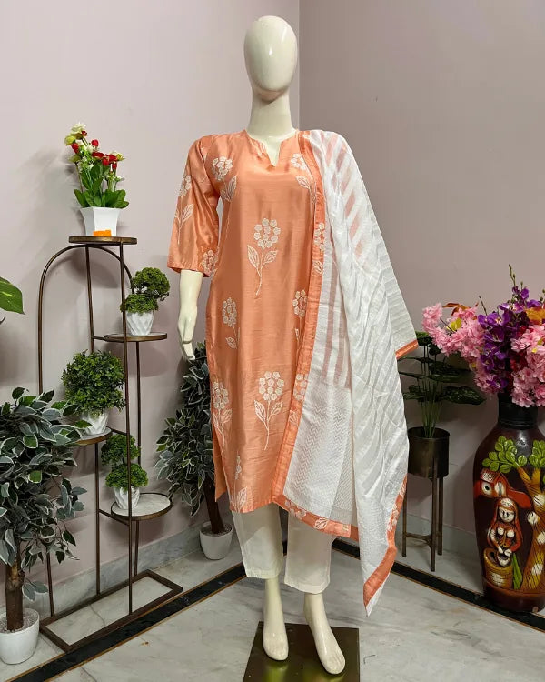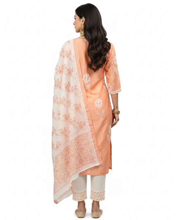 Step into elegance with this soothing peach three-piece kurta set, beautifully detailed with white floral prints. The kurta features a straight silhouette with a notched round neckline and elbow-length sleeves, offering both comfort and sophistication. It is paired with solid white straight pants that enhance the subtle charm of the ensemble. Completing the look is a lightweight white dupatta adorned with peach borders and delicate woven patterns, adding a graceful finishing touch. Crafted from soft and breathable fabric, this outfit is perfect for festive gatherings, casual celebrations, and day events.