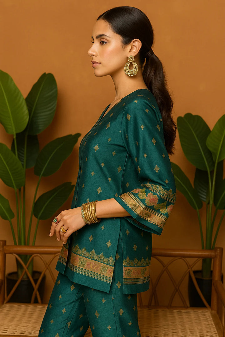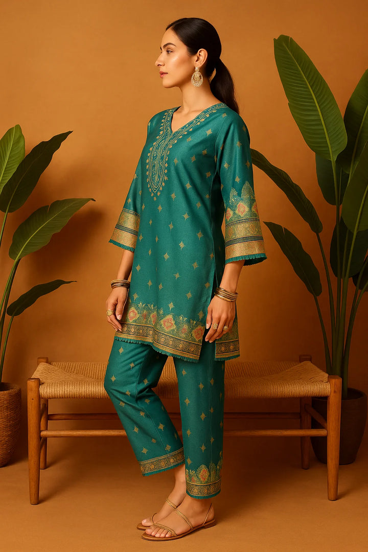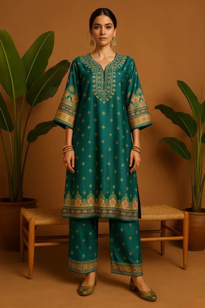 Add a royal touch to your festive wardrobe with this stunning teal kurta set. Crafted from a lustrous silk blend fabric, this ensemble features a beautifully embroidered neckline and ornate traditional motifs throughout the kurta. The matching pants, designed for comfort and elegance, complete the regal look. Ideal for festive functions, traditional gatherings, or wedding occasions.