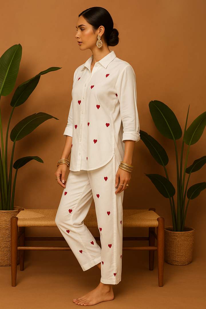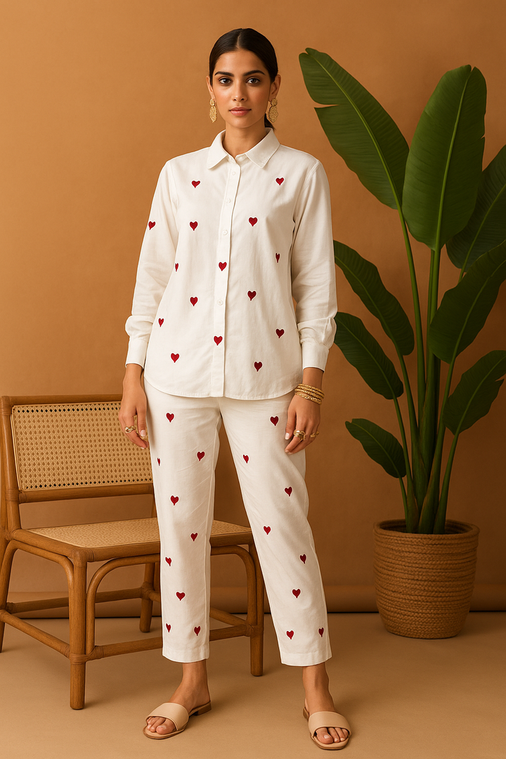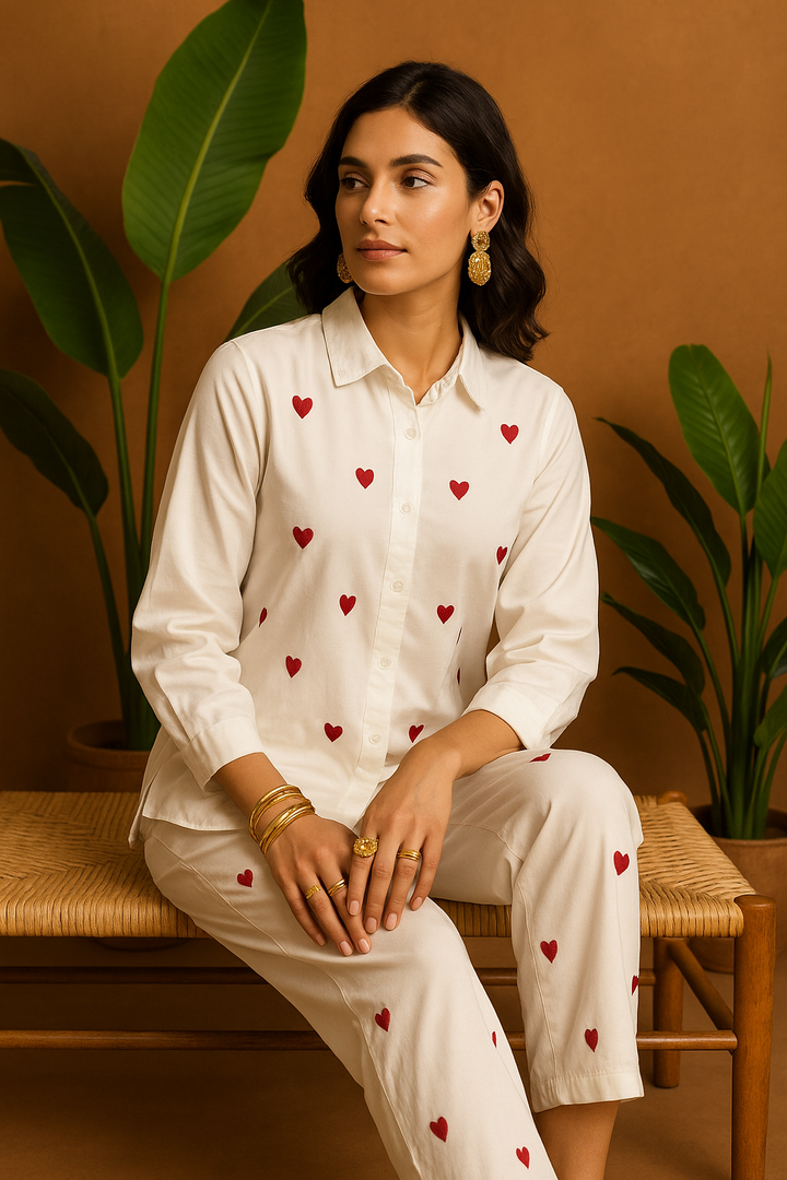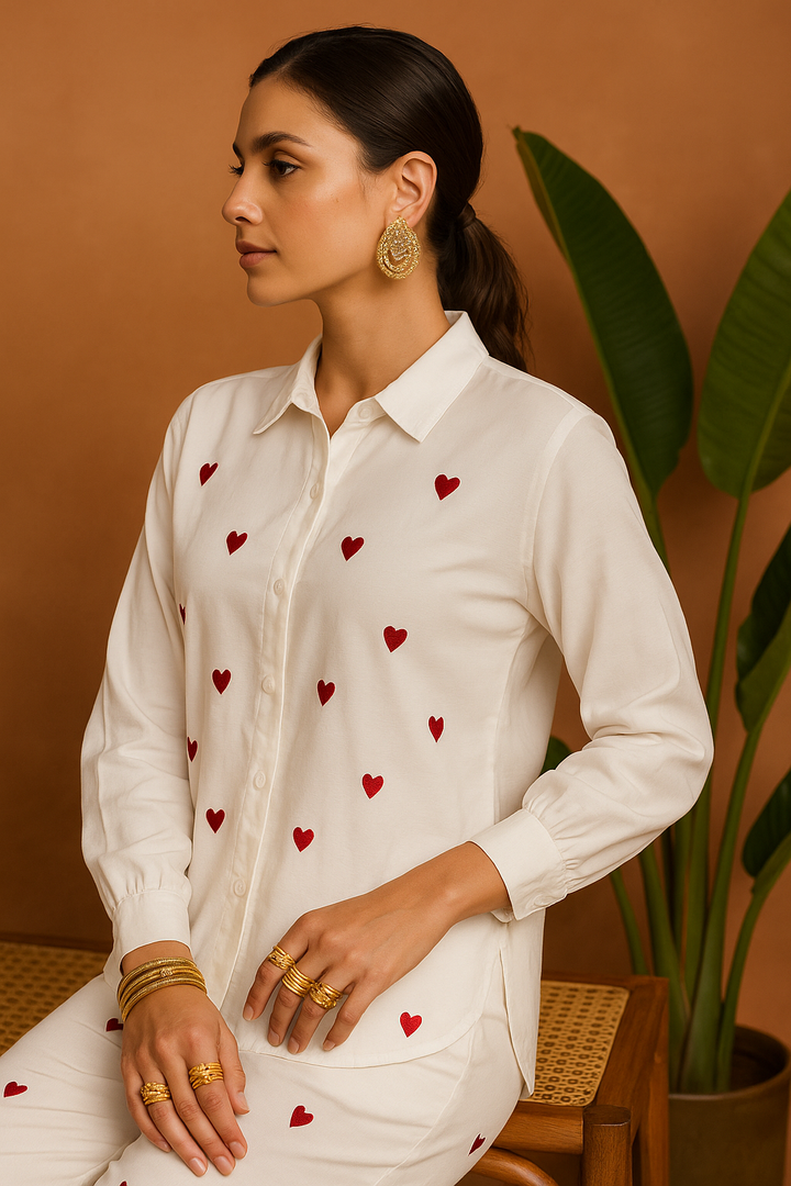 Product details/information: Add a touch of love to your everyday wardrobe with this adorable heart-embroidered shirt. Featuring tiny red hearts scattered across a crisp white base, this button-down is perfect for casual dates, brunch looks, or a sweet office vibe. The high-low hem adds a modern twist to this timeless piece.