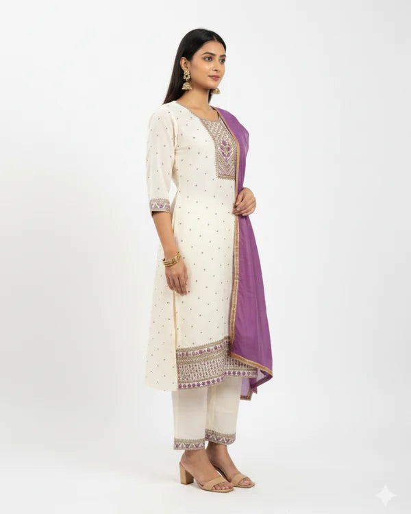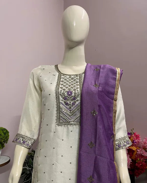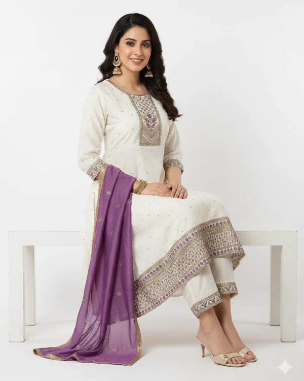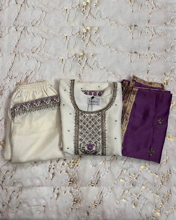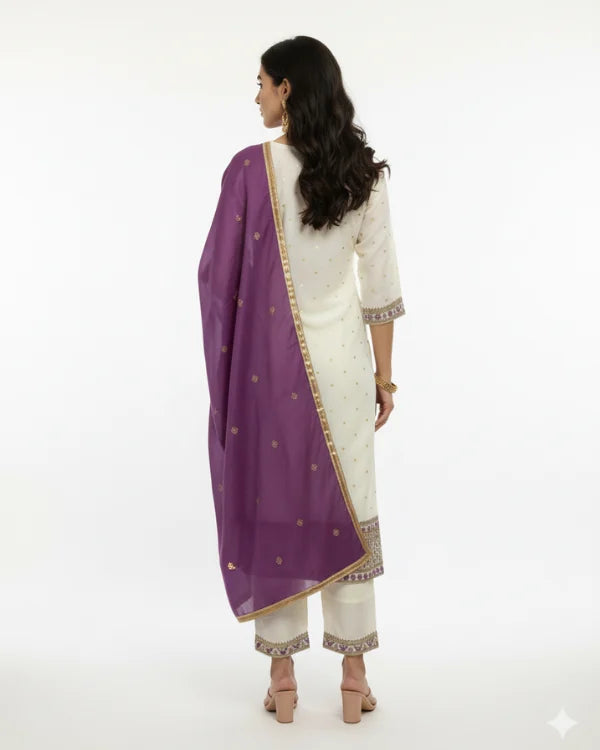 Step into elegance with this graceful white kurta set, beautifully adorned with intricate embroidery. The straight-cut kurta features detailed thread and sequin work on the neckline, borders, and hemline, adding a refined ethnic charm. Paired with matching white pants featuring embroidered edging, the ensemble ensures a polished and comfortable look. The highlight of the set is the contrasting purple dupatta, enhanced with golden lace borders and delicate embellishments, which lends a vibrant pop of color to the sophisticated white base. Ideal for festive occasions, traditional gatherings, or semi-formal events, this outfit is a perfect blend of subtlety and elegance.