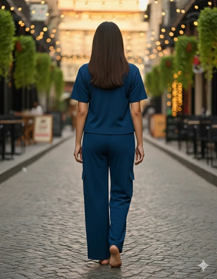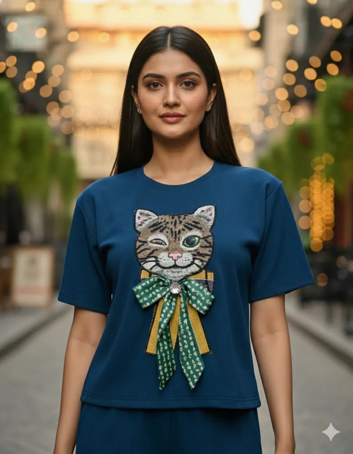 A stylish and trendy co-ord set featuring a soft, comfortable top adorned with an embroidered cat motif and a decorative bow detail. Paired with wide-leg cargo-style pants, this co-ord set offers a perfect blend of playful charm and modern elegance. The rich teal-blue shade adds sophistication, making it suitable for casual outings, daily wear, travel, or relaxed evening looks. Designed for comfort with a chic silhouette that flatters every body type.