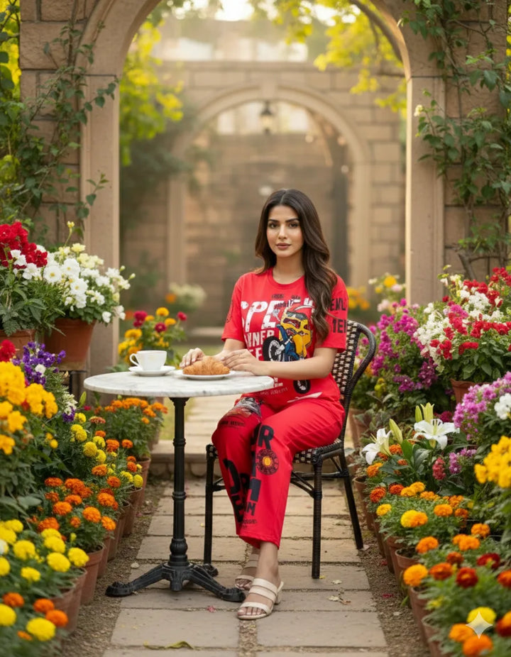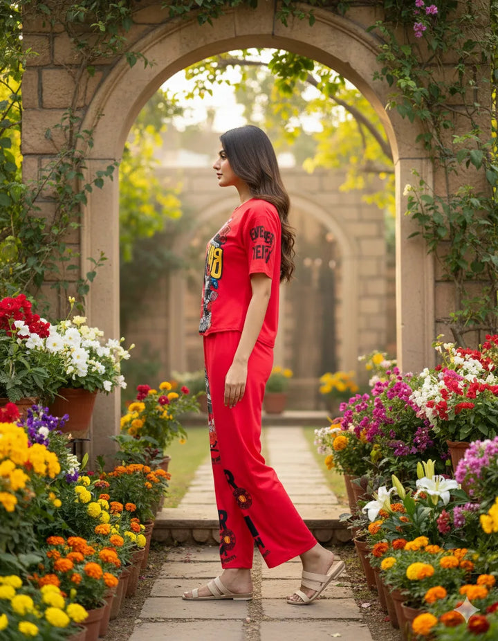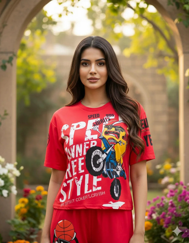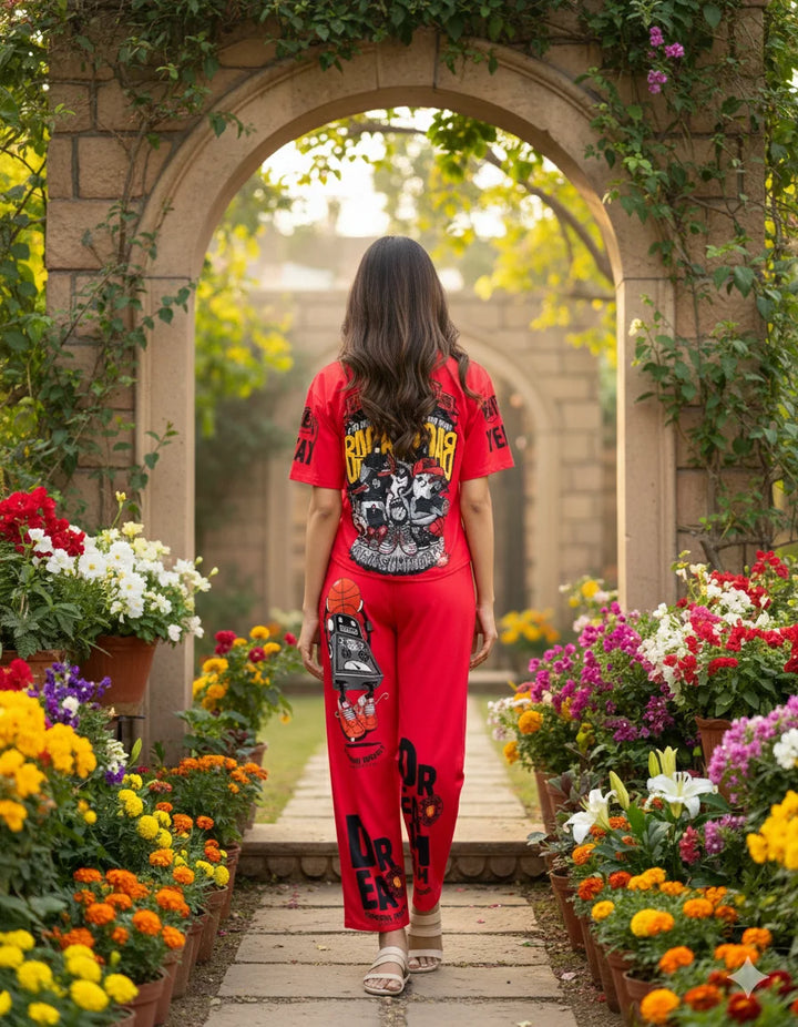 A vibrant and stylish co-ord set featuring a relaxed-fit printed T-shirt paired with matching jogger-style pants. Designed in a bold red base with eye-catching multicolour sporty graphics, this set offers a perfect blend of comfort and youthful street-style appeal. Ideal for daily wear, travel, lounging, or casual outings, the soft fabric ensures all-day comfort while the trendy prints add a fun, energetic look.