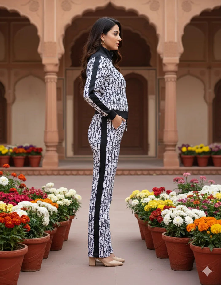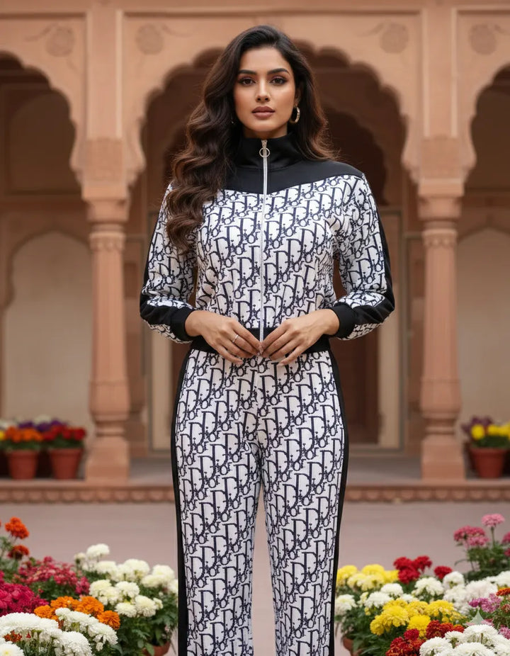 A premium and fashion-forward co-ord set featuring a high-neck front-zip jacket paired with straight-fit pants. Designed in a white base with an elegant navy monogram-style print, this outfit combines luxe aesthetics with everyday comfort. The top includes a contrast black yoke and sleeve detail, adding definition and a sporty-chic edge. Perfect for travel, brunch outings, airport looks, or stylish casual days.