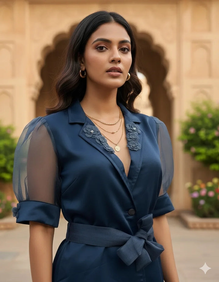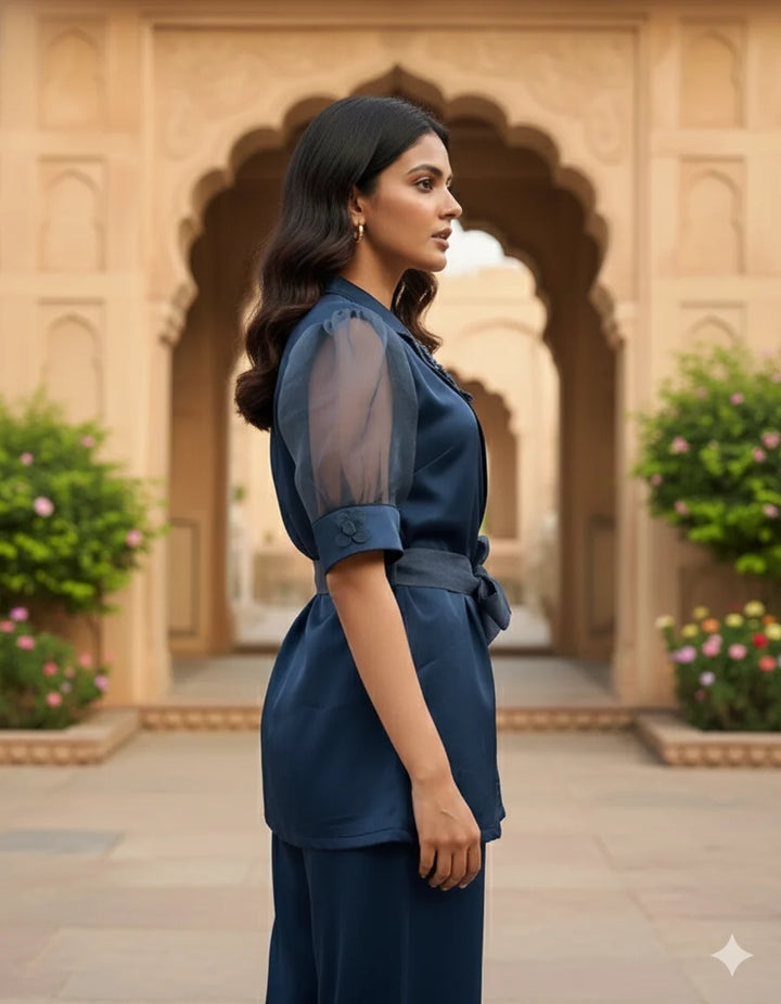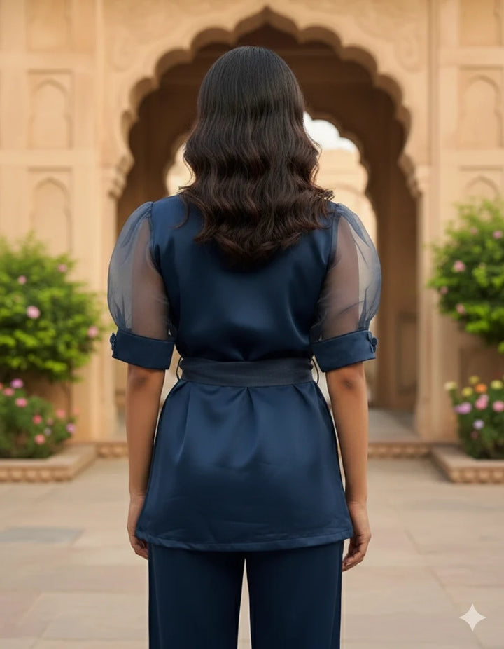 An elegant and premium navy blue co-ord set featuring a satin-finish top with sheer organza puff sleeves. The top includes a stylish embroidered collar and a waist tie-belt that adds structure and sophistication. Paired with matching straight-fit pants, this ensemble offers a refined and polished look. Perfect for parties, festive gatherings, formal dinners, evening events, and stylish outings.