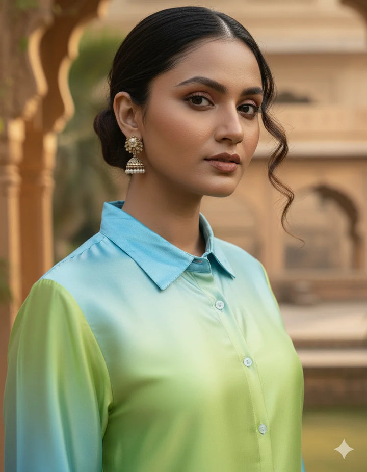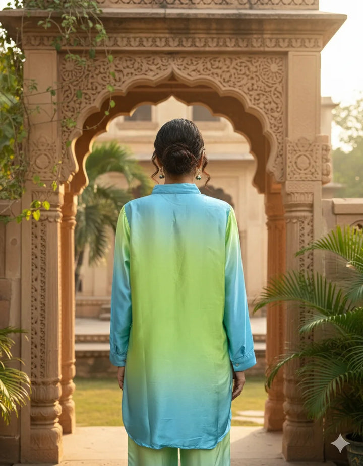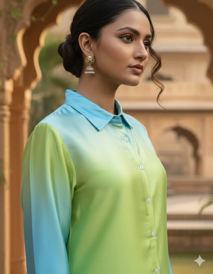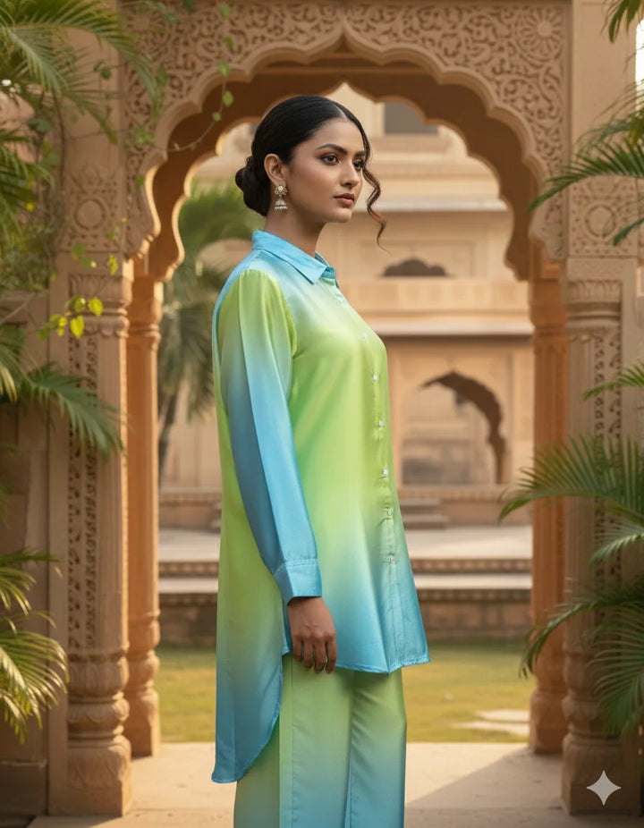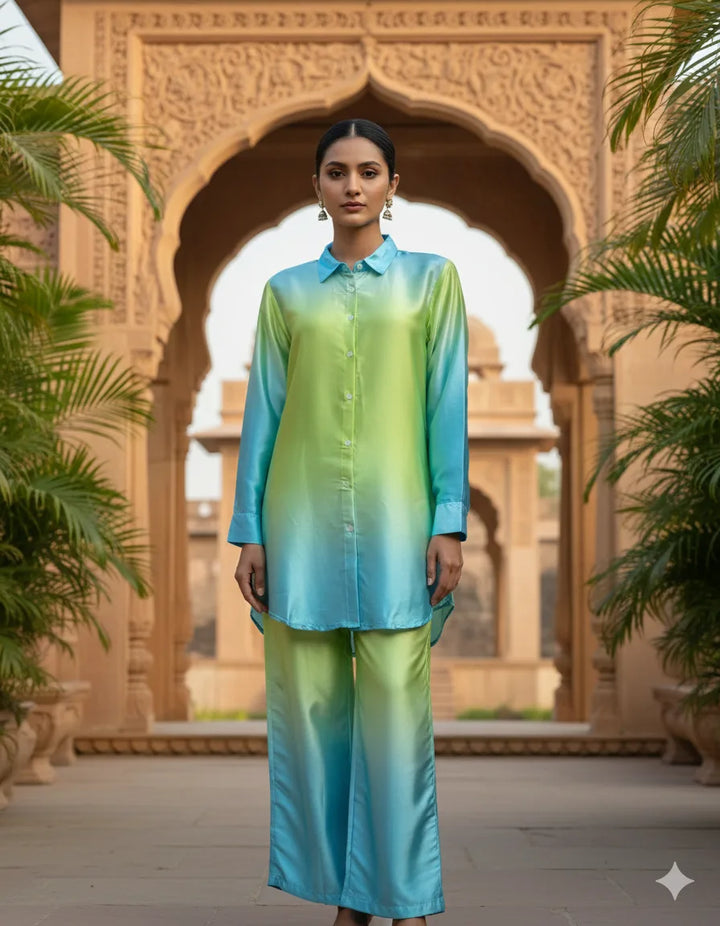 A premium and elegant satin co-ord set designed in a soothing ombre blend of lime green and aqua blue. The set features a long button-down satin shirt paired with wide-leg satin pants, offering a luxurious drape and a smooth, glossy finish.